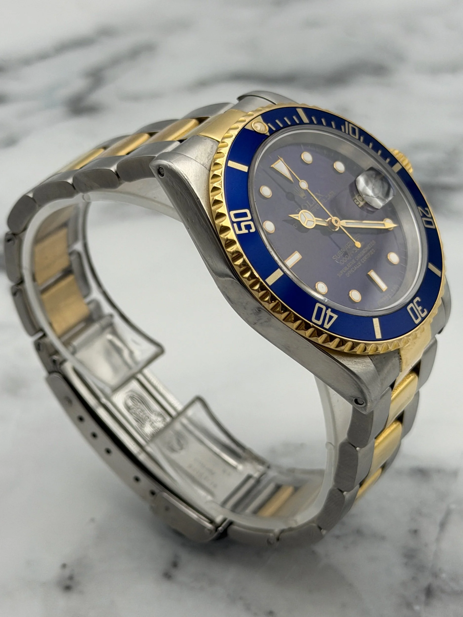 For sale is a beautiful example of the classic Rolex Submariner ‘Bluesy’ Ref. 16613. With it's beautiful aged purple dial this piece is presented in brilliant condition with its sharp case, clasp and bracelet, showing little signs of wear across the watch. This piece has maintained its original bezel, dial, correct clasp (R) bracelet & end links making it a fully original for its year 1991 and a perfect birth year watch.