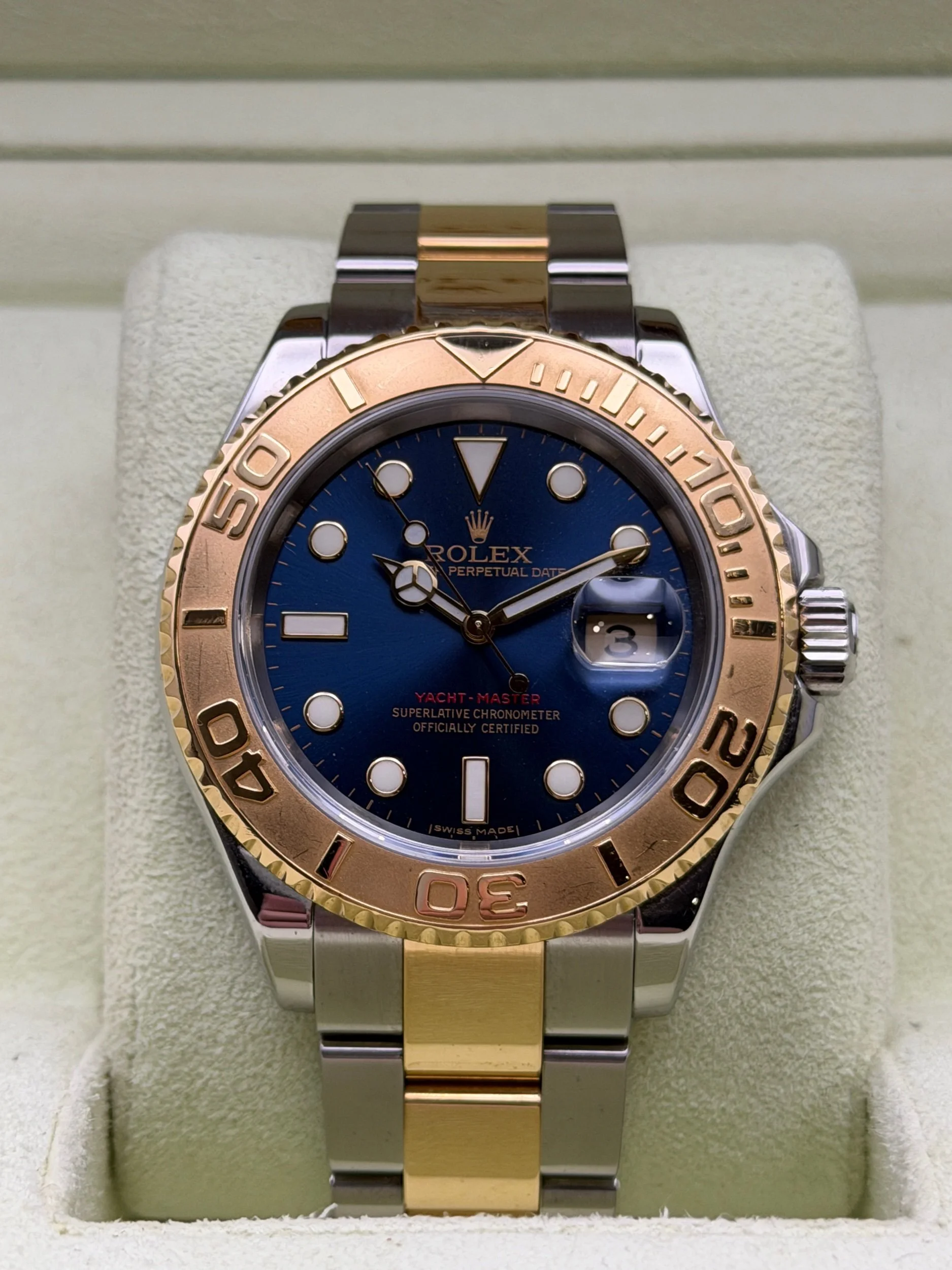 For sale is a beautiful Yacht-Master presented with the blue dial. In stunning original condition with no major marks or scratches. Accompanied by the full rolex set (Box, outer box, warranty card, leather wallet, both tags (red & green serial tag) & all booklets. It's totally original, dial, hands, bezel and bracelet with correct year clasp code also add to the provenance of this gorgeous piece.